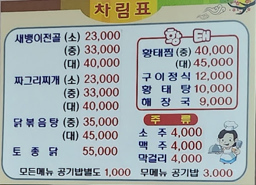 Read more가격이착한집? 글쎄요 .. 황태찜 3.5만원 7조각? 셋이먹는데 두조각씩먹었네요 공기밥 따로 시키구요 , 반찬 맛은있습니다 근데 너무 조금씩줘서 자꾸 리필 시키기 좀 눈치보이구요 어떤건 더달라니까 없다고하네요 나올때보니 반찬 세팅된곳에 많던데요;; 황태찜 맛은 매운맛 거의없고 전분이 들어가 매콤하고 깔끔한맛 기대하시면 안될듯, 떡갈비 수제로하고 퀄리티 괜찮습니다 그러나 이것도 두께가 얇아서 양은 얼마 안되구요 , 소스가 마요네즈베이스인데 너무 달았습니다 입맛은 다 다르겠지만 이정도...