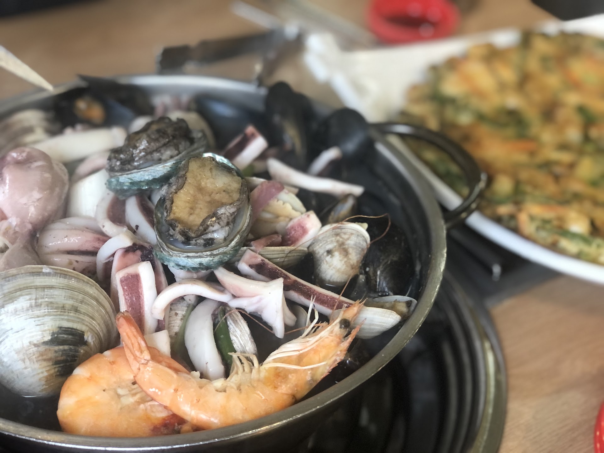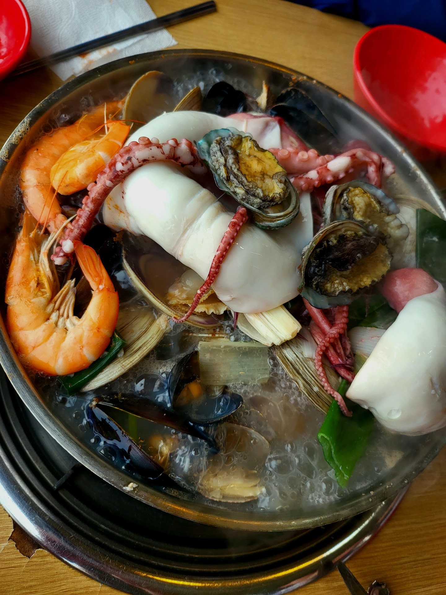 Read more맛있고 혜자스러운 해물칼국수 집. 이 집의 칼국수는 먼저 해물이 가득 들어간 해물탕을 먹은 후에 그 국물에 칼국수 면을 넣어 먹는 방식이다. 일단 살아있는 전복과 씨알이 굵은 조개를 넣어준다는 점이 좋았다. 그리고 이 집의 백미는 손칼국수 면발인데, 어렸을 적 시골에서 할머니가 직접 손으로 썰어주신 칼국수를 상기시킨다. 칼국수와 더불어 먹는 김치도 아주 훌륭하다. 마지막으로 해물파전 또한 넉넉하게 들어간 싱싱한 해물과 달달하고 아삭한 파의 조화가 좋았다.