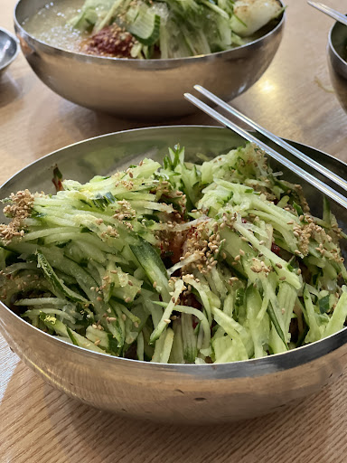 Read more우선 식당이 인기가 아주 많은데 웨이팅 리스트를 적는게 아니고 정말 말 그대로 줄서서 웨이팅하는 시스템이라 되도록 일찍 가시길 추천해요. 하절기엔 10시 반부터 오픈한다고 되어있었어요. 저희는 11시반에 가서 먹고 나오니 줄이 엄청 길더라구요 밖에. 냉면 자체는 우선 양이 어마무시해요 특히 물냉면은 그냥 기본이 곱배기에요..ㄷㄷㄷ 국물이 적을 만큼요ㅋㅋ반찬은 무고명 정도 주고 옆에 육수 그릇이 있어서 따뜻한 육수를 즐길수 있는데 짭짤하고 표고버서 고명이 있어서 나름 먹을만해요 사실 물냉이나 비냉이나 맛의 차이는 크게 없어요 똑같이 중상타맛에 양의 차이만 있을뿐 고명에 오이와 배른 쏟아부어서 달고 시원한 맛이 참 좋았어요. 직원분들도 바쁜데도 친절한 편이구요. 가실려면 3초라도 일찍 가시길 추천합니다. 옆에 작은...