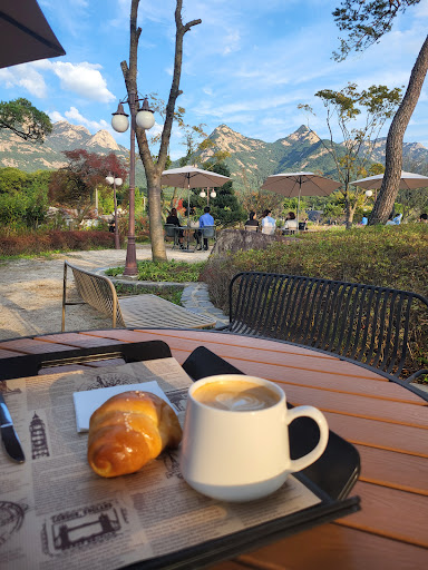I asked myself many times if this was paradise? I loved this bakery cafe so much. It's literally, eunpyeong gu which is still in Seoul, cross the bridge and watching the Bukhansan you will get to this bakery cafe in Goyang in minutes. There's seating outside and inside, a big bakery cafe, plenty of options, cakes, and a big flower garden, mountain views, stairs.. I had an amazing experience and I think I was so lucky because of my seat outside. When it's autumn in Korea, it's one of the best times to sit outside in a nature filled cafe. The healing atmosphere overthrows the expensive pricing of the items, that because of the views can be a bit over the top. But it's completely worth it. I've had a good coffee and the salt bread I had was...