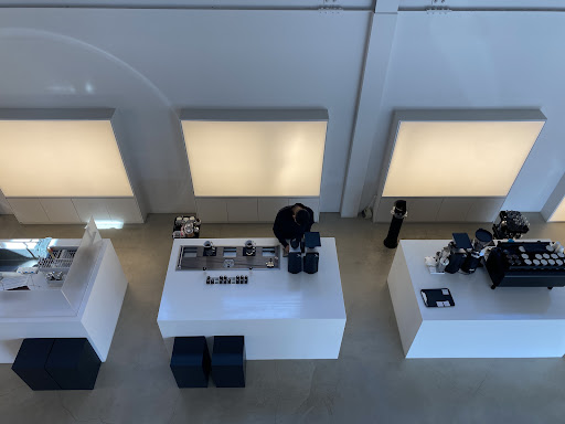 Designed by cafรฉ interior veteran GGJH (๊ณต๊ฐ์งํ) the minimalist concept incorporates a mezzanine flooring system, four cubic service counters and exposed structural steel from the original structure. All the furnishings have been carefully selected to match each seating area, from stainless steel stools, long black sofas and retro Breuer B-32 styled desk chairs. Keeping with the minimalist theme, the design plays on contrasting light, from dimly lit light boxes shining out from the walls, behind tables and chairs to the original warehouse windows flooding the space with natural light from the second floor.