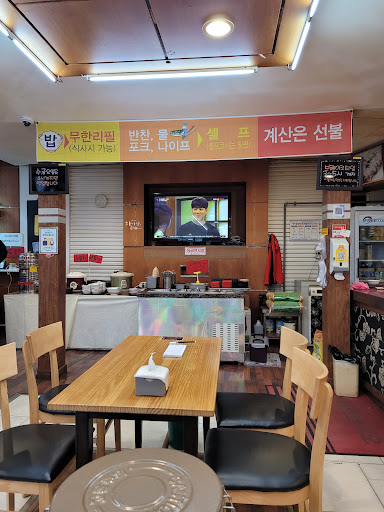 반찬은 셀프바를 이용하고, 만약 공기밥을 더 먹으려면 그것도 추가비용 없이 셀프바에서 이용하면 됩니다 겨울철 뜨끈한 국물과 함께 떠다 드시면됩니다 물도 셀프더라구요! 계산은 선불이었어요 기본적인 것만 알면 헤메지않고 주문도 잘 할 수 있는 것 같아요^^