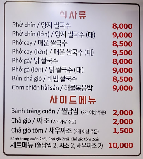 Read more구글지도 생성완료! 매장이 작아요 5개 테이블이 있어요. 입구에는 베트남 식료품을 팔더라구요 또 좋았던 거는 현지 음료를 먹을 수 있어서 좋았어요 맑은 거는 양지쌀국수고 빨간 거는 매운쌀국수에요 매운 쌀국수는 한국인 입맛에 더 맞는 거 같아요 베트남 부부께서 운영 하셔서 현지와 가까운 맛을 내는데 그래도 향을 약하게 내시는서 같아요. 짜조도 주문이 들어오면 튀기시는거 같아요. 따뜻하고 향이 풍부했어요. 하지만 사장님이...