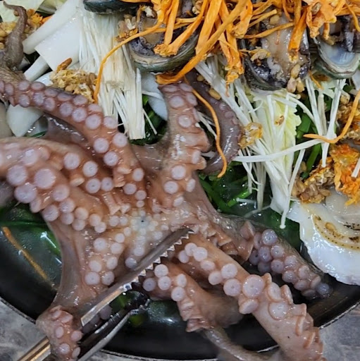 살아있는 피문어를 보는 앞에서 통째로 넣어주며 전복, 가리비와 키조개, 새우까지 재료를 아낌없이 넣어 푸짐하게 내어준다