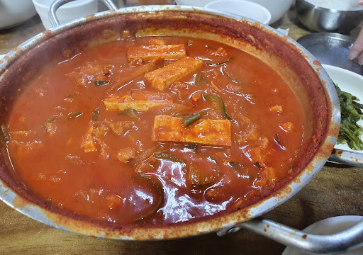 Read more네이버에 평이 안좋아서 괜히 가는거 아닌가 걱정했는데 그래도 유튜브에 뜨기전부터 먹어 보고 싶었던 음식이라 다녀와봤어요 다른데 일 보고 11시에 혹시나 대기표라도 미리 받아볼까하고 들러봤더니 11시35분부터 된다고 기라리라고해서 1번으로 들어갔어요 12시에 오신분들은 대기표받고 기다리더라구요 저희가 12시10분에 밥 다먹고 나왔는데 이미 대기 15번쯤 됐더라구요 네이버평점에보면 반찬이 전부 짜고 맛없고 찌개도 먹다말고 나왔다는 말이 있거나 아니면 너무 맛있어서 생각난다는 사람도 있던데 저한테는 또 가고싶은 맛이에요 한번씩 생각날것같아요 매운게 맛있게 매운맛이고 단맛이 없고 맵기만 하다는데 전 단맛도 느껴지더라고요 입맛은 다 다르니까요 ㅎㅎ불닭 즐겨 드시는 분들은 편하게 먹을 맵기에요 건더기도 너무 없다고 하는데 저는 친구랑 둘이 2인분에 밥하나씩 다 먹고 찌개가 많이 남아서 밥 한그릇 더 시켜서 나눠 먹으니까 딱...