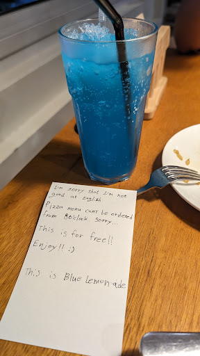 After looking on the menu I decided to go for pizza, but apparently it was not available after 8PM. The staff was so cute and wrote us a small note in English that they are sorry about it, and they offered us a free lemonade.