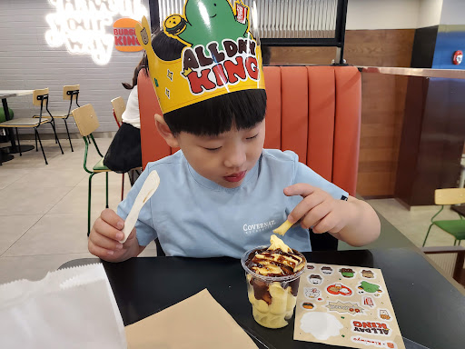 막내 데리고 감자 튀김 먹으러 종종 들릅니다 종전에 있던 버거킹이 없어져서 아쉬웠던터라 다시 생겨 반가웠는데 접근성의 한계가 있어 그렇게 자주 가지는 못해요 지난번 방문때는 직원분이 행사중인 스티커를 몰래 챙겨주셨어요 그리고 음식 픽업을 위해 제가 갔을때는 수줍게 왕관도 가져가셔도 돼요라고 말하는 모습에 아들도 직원도 귀여웠습니다 음...망고 아이스크림은 매우 달아서 다 못 먹었습니다