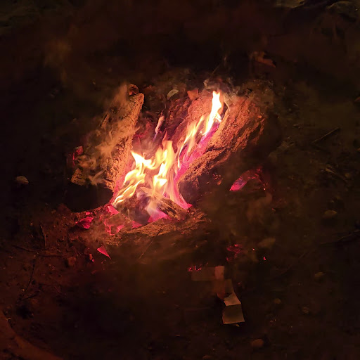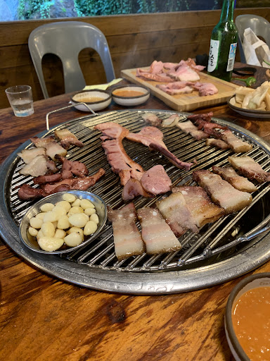 Even though I gave this less than perfect stars, I would recommend it whole-heartedly. It's got that outdoor camping charm, complete with wooden swings, firepits with campfire's blazing, and all wood tables, benches, etc. This place has clearly been here for a while, and sees a lot of business. The food was normal..... duck and pork that is delivered uncooked which you then cook in the middle of your table on a grill. Nice. Yummy. The trouble here for us, was that there seemed to be a thin layer of greasy, smokey oily residue on nearly everything. We left feeling like we needed to take a shower and wash our clothes. That said, if they could pull out and use a power washer on .... well, everything...... this place would be fantastic. Still, despite these misgivings, the food was as expected, yummy, and the staff were friendly and...