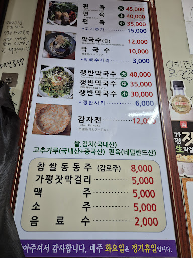 Read more채소가 신선함 여름에는 텃밭에서 바로따서 내준다고 하심. 겨울엔 채소가 안나서 어쩔수없이 사서 하는데도 굉장히 신선함. 막바지 겨울철에 봄이 이제 오려나보다.. 하는 생각이 들 정도의 신선함을 느낄 수 있음 막국수가 맛있음. 사람입맛에 따라 육수양이나 겨자 설탕 첨부해서 먹을 수 있음. 신세대들은 육수 조금 겨자 많이 설탕 조금해서 먹는 것 추천함. 옆 테이블 아저씨 육수랑 설탕 들이붓는거 보고 따라하다가 싱겁고 달아져서 겨자 많이 뿌려먹음.. 그래도 맛있음. 기본에 충실한 육수 겨자 면빨의 오케스트라 3중주를 듣는 듯한 맛. 정말 거짓말 안하고 시골에서 농사짓던 고모할머니가 만들어주시던 막국수보다 약간 맛있음. 편육이 맛있다. 편육 맛있음. 편육보다는 편육보쌈이라고 하는게 맞는것 같은데. 보니까 퍼석퍼석한 부분이랑 기름진 부분 나뉘여져 있어서 이건 뭘까 하고 보니까 쫄이듯 삶은 거임. 되게 오래 삶은 것 같음. 색깔도 보니까 연하게 양념을 한 뒤 되게 오래 삶아서 만든 것 같음. 하여튼 편육 맛있음. 꼭 드셈. 근데 소짜리 시키면 20000원인데 아는 사람이 그런데 여기는 중짜리부터 제대로 나온다고 중짜리 시키라고 조언해줌... 소짜리는 별로고 중짜리 시켜라... 2명이서 막국수 2 편육 소 시켰는데 배불리 먹고 나옴. 3명이가면 그냥 막국수 3 편육 중 시키면 될거라고 생각함. 떡국은 겨울에만 한다. 아는 분이 직접 찾아와서 떡국 만 먹고 갈 정도로 떡국도 보통은 아님... 다만 겨울 한정...