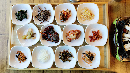 The owner assured us that they only put mushrooms and vegetables into the broth for the stew. The stew comes in a large pot with a pretty tower of vegetables, tofu and mushrooms. It is served with rice and a lot (12!) of side dishes.