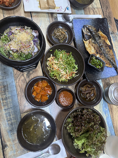 We were also amazed by the number of side dishes and salads that accompanied our meal. For our main dishes, we ordered bibimbap and grilled mackerel, both of which were absolutely delicious, fresh, and of excellent quality.