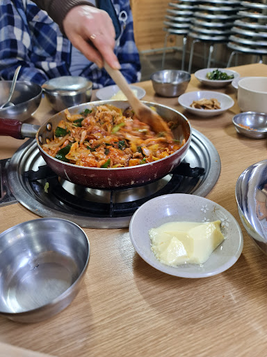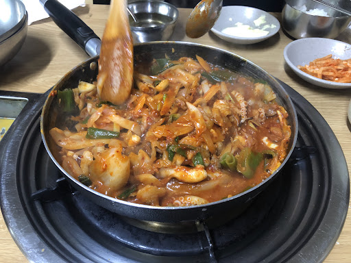 Read more경주 외동에서 울산 가는 7번국도 길목에 위치한 가게입니다. 원래 기사식당으로 시작했던걸로 아는데, 낙지와 삼겹살을 같이 볶아서 내주는 집으로 지역에서 유명합니다. 들어갈때 바로 인원수대로 주문이 되어 신속하게 밥상이 차려집니다. 반찬으로 내주는 얇작한 계란찜이 부드럽습니다. 4분을 기다려 냄비뚜껑을 열어 뒤섞어주면 풍부한 낙지와 삼겹살이 여러분을 반겨줍니다. 무김치, 콩나물, 밥이랑 같이 양푼에 비벼먹거나 쌈싸먹으면 너무 맵지도 않고 맛있지요. 고기들은 조방낙지 느낌이라고 해야할까요, 다른 곳에서는 은근히 찾아보기 힘든...