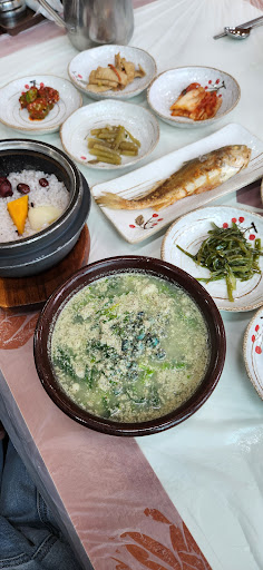 Read more다슬기탕, 추어탕, 닭계장, 해물된장, 순두부를 고르면 돌솥밥과 함께 먹을 수 있어요. 점심 식사시간을 조금 지나면 조용히 먹을 수 있지요. 첫음식으로 나오는 초록얇은 전은 인원수에 따라 꼭 1/N해서 먹기 시작하세요. ㅎㅎ 반찬도 다 맛나요. 국 포장도 저렴하답니다. 한가지 아쉬운 점은 된장찌개가 조금이라도 나오면 숭늉을 먹을 때 더 맛날 것 같아요. 충효동에서 가게에 들어갔다면 나올 때는 좌회전이 안되니 조금...