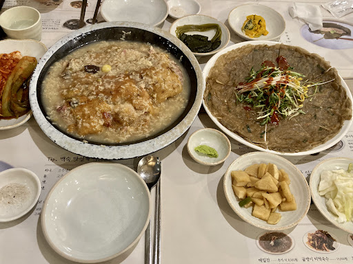 Read more🤩방을 미리 예약하지 않으면 스케쥴이 꽉찬 누룽지백숙 전문점. 🐓당일예약하면 홀에서 식사하기 다반사. 미리예약하는 센스! 를 발휘해야한다.😁지도상에선 한강뷰를 기대했지만 소나무만 구경할 수 있다. 기다리는 도중에 메밀전이 나오는데 보들한 가운데 식감과 외곽의 바싹함 그리고 새싹과 함께 싸먹는 초장의 아삭함까지 입맛돋우는 식전요리로 제격이다. 찬은 크게 특별하다는 느낌을 못 받았다. 대표메뉴인 엄나무누룽지백숙은 누룽지가 뒤집혀서 나오는 비쥬얼이 탁월하며 🦴 뼈에서 토종닭의 기골이 느껴지며 살은 부드럽기까지 하다. 누룽지의 쫀득쫀득한 고소함과 굳히 먹는 레시피를 따라하지 않아도 맛이 좋다. 😋 가히 대표메뉴라 할만하다. 국물이 뜨끈하며 먼가 보양이 되는 느낌이 든다라고 할까? 자연능이토종닭백숙은 국물위주의 좀 더 시원한 맛이 좋고 찹쌀밥을 말아먹는 느낌으로 먹으면 개운하고 깨끗한 느낌이 있다. 탄수화물 베이스에서 단백질베이스로 옮긴 느낌이 있다. 파향도 달달하게 좋고 능이의 향이 적절하게 베어있다. 이 메뉴또한 좋다.👌🏻 이 집에서 강추는 골뱅이 미역국수!!! 기호에따라 틀릴수 있지만 미역국수도 좋았을 뿐더러 실한 골뱅이며 고추장소스와 오이와 겉절이 상추의 아삭함이 절묘하다. 엄지척!!! 😎👍🏻 아쉬운건 아무래도 후식! 거한 메뉴일수록 백숙 트름을 잡아줄 강력한 입가심이 아쉽다. 개발하면 좋을 듯!!! 🙏🏻🙏🏻🙏🏻 1000원짜리 아이스크림을 파는 건 좀 별로다. 양이 적은 👨👩👧👦4인가족이라면 자연능이백숙+골뱅이미역국수 /...