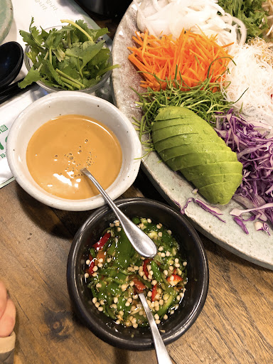 Read more메뉴판 그대로 신선한 야채, 푸짐한 고기, 따뜻한 쌀국수가 아무리 먹어도 무한리필되는 🇦🇺호주식월남쌈 전문점. 😊👍🏻아보카도 🥑도 추가!!! 무한리필집은 신뢰하지 않는데 이 집은 청결하고 특히 재료들이 신선하다. 원래는 좌식이었으나 최근에 식탁형태로 바꿨다. 언제나 손님이 많고 벨을 누르면 달려오시는 아줌마들이 친절해서 더더욱 좋다. 소스는 땅콩소스와 매콤한 간장특제소스가 있는데 취향대로 먹으면 된다. 다 좋다. 고기는 🦆오리고기와 🐷 돼지고기, 🐂소고기 세 종류가 나오는데 열초로 식사하는 동안 따뜻하게 데워준다. 렌지를 사용하지 않아 아이들에게도 안전한 편이다. 라이스페이퍼를 뜨거운 물에 살짝 데친 뒤 야채와 고기를 소스와 함께 맘껏 먹으면 된다. 🧒🏻👦🏻아이들도 손수 싸먹는 재미가 쏠쏠하다. 고수도 한켠에 썰어주신다. 마무리는 쌀국수 🍲^^ 👨👩👧👦가족끼리 부담없이 즐길수 있는 건강한 맛집이다....