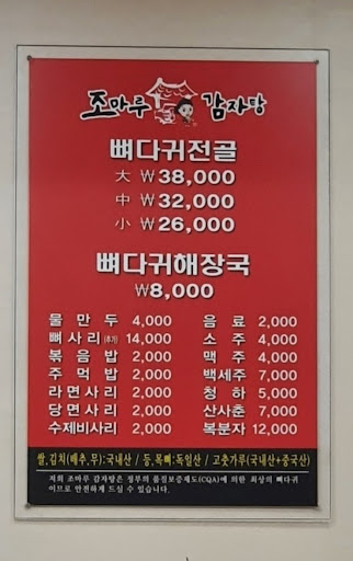 조마루 감자탕 맛있다. 2층에서 일하시는 다리가 날씬하신 분은 기억력도 좋으시고 엄청 친절하시다. 말도 이쁘게 하신다. 가령 포장을 할 때는 일하시는 분에게 가장 맛있는 부위로 골라서 담아주세요. 이렇게 말하신다. 나도 배우고 싶다.