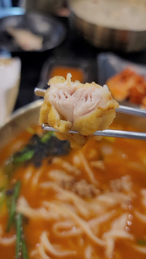 음식은 닭국수를 주력으로 하고 있습니다. 일반 닭국수부터 전복, 불고기 등 여러 고명이 들어간 것들까지 선택지가 다양합니다. 저는 들깨닭국수와 불고기 장칼국수, 닭 안심 탕수육을 주문했습니다. 고소한 들깨와 얼큰한 장칼국수를 번갈아 먹으려고 했습니다. 닭이 통으로 들어가 있는 들깨닭국수와 불고기 고명이 올라간 장칼국수가 나왔습니다. 들깨닭국수는 구수합니다. 밍밍하지 않고 적당한 고소함과 시원한 닭 육수 맛이 느껴집니다. 하남현지인맛집 파주닭국수 하남미사점의 육수는 나가사키 짬뽕처럼 담백하면서 깊은 맛이 납니다. 맵지 않아 남녀노소 누구나 먹을 수 있는 맛입니다. 부드러운 닭다리 살을 뼈와 잘 분리해 먹었습니다. 중간에 겉절이 김치를 맛봤는데 이거 참 별미입니다. 아삭함이 살아있는 배추이고 간이 딱 적절합니다.