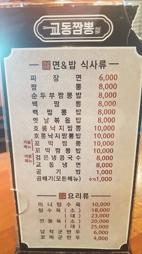 Read more강릉 교동짬뽕 생각하며 먹으면 못 먹을 맛이다. 수입산 냉동 수산물의 맛이 그대로 느껴진다. 흔핫 동네 중국집보단 약간은 매콤한 맛. 순두부짬뽕인데 순두부는 기성품 반개 정도의 양이 들어가있다. 볶음밥은 기름이 너무 많아 느끼하다. 백짬뽕은 육수 본연의 시원함과 얼큰한 맛이 가미되어야 할텐데 기성품 조미료의 향이 너무 진하다. 미니 탕수육은 정말 미니. 그래도 만원인데 맛만 보라고 내어놓는 양이다. 한 3~4년 전엔 맛있었는데 어느 순간에서부터 맛과 양이 현저히 떨어졌다. 지나가다 짬뽕 먹고 싶으면 한 번 정도는 가 볼만한 집. 옆의...