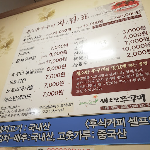 익산시 영등동 시가지 뒤쪽(?)에 위치한 새소반 쭈꾸미입니다. 네비게이션 찍고 오는 거 추천합니다. 초행길에는 찾기 어려운 편이에요. 쭈꾸미세트(쭈꾸미볶음+도토리전+도토리묵사발+새소반샐러드+밥)을 먹으러 많이들 오는 곳입니다. 4인석, 6인석 방이 6개? 정도 되는 거 같고 단체로 들어가는 방도 있습니다. 어른들과 여러차례 방문했는데, 다양하게 나오는 편이고 맛도 괜찮은 편이라 좋습니다. 샐러드는 이전에는 쭈꾸미가 들어가 있었는데, 올해부터는 안들어가는지 빠져있었습니다. 도토리전이 뜻밖의 꿀맛! 이고 넘나 맛있어요흐흐 4인이서 4인세트 먹은 거고, 양은 많습니다. 여자분들끼리 오시면 4명이서 3인세트도 충분할 거 같아요. 영업시간은 오전 11시부터는 오후9시까지(주문은 오후 20시 40분)입니다. 3시부터 5시는 휴식시간입니다. 매달 1,2,4째 월요일은...