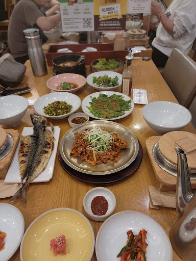 Read more송도에 사는 지인분의 초대로 방문하게 되었다 성인 5명에 아이 2명~ 주말에는 예약을 하지 않으면 웨이팅도 길고 복잡해서 미리 토요일 11시 30분에 예약을 해놓았다고 한다 큰 상가 건물 2층에 있었고 가게 규모도 꽤 큰듯 하다 오늘부터 10월 9일 월요일까지 연휴라서 복잡할줄 알았는데 그렇지 않고 오히려 다른 때보다 한가한 모습이었다 연휴 기간에 여행을 간 사람도 많고 오늘 밤에 하는 한강 여의도 불꽃축제 영향인것 같기도 했다 반찬 종류가 무지 많았다 잡채에 명란젓갈 샐러드 우엉조림 겉저리 미나리전 등등 주메뉴로는 갈비찜 쭈꾸미볶음 간장불고기 고등어구이 꼬막무침 등등 게다가 밥은 돌솥밥이다 기본 반찬은 셀프로 더 가져다 먹을수도 있다 반찬 종류가 많아서 여러 가지를 맛볼수 있는 것도 좋고 여러명이 식당 메뉴를 정할때 의견이 갈릴수 있는데 한식을 좋아하는 사람이라면 메뉴 때문에 신경을 쓰지 않아도 된다는 것이 좋은점 인것 같다 후식으로 식혜도 준비되어 있다 반찬들의 맛은 자극적이지 않았고 양은 적당했다 집에서 이렇게 해먹기는 쉽지 않고 한식이 먹고 싶을때 한번쯤 방문해...
