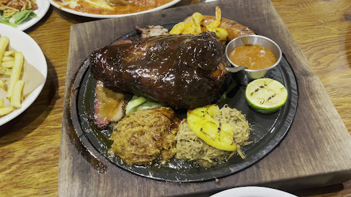 포크해머플래터세트 / 칼로 써는건 직원이 안해주고 우리가 직접해야 한다. 겨우겨우 칼로 분해했는데, 속은 훈제라 그런가 훈제오리색깔이었고 식감은 너무 찔깃한게 엄청 부드러운 육포같고, 그냥 수제햄같았다. 내가 이 딴딴하고 찔긴걸 썰어야 한다니? 나는 돼지 정강이 뼈가 어떤 구조인지 몰라요. 칼을 어디로 어떻게 집어넣어 발골해야 하는지 모름요?