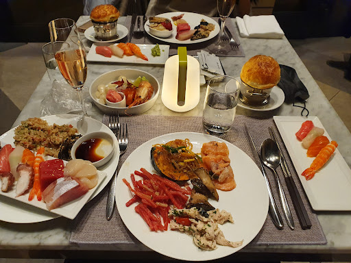 The food is delicious, fresh, and primarily protein options. They do not skimp or cheap out in ingredients or the dishes served. There was only 3 “carbohydrate” dishes. The sushi was made in front of you. Everything was a premium cut. They had fatty tuna and a few unique ones bite dishes at the sushi station. Very very good. The Chinese station was superb. The crab legs are endless and I highly recommend loading up on these. So good. The cheese shrimp sauce, spicy beef, and seafood stir fry were all great and could be a main course at any high end restaurant. The American station had the famous lamb steak with mint jelly sauce. Wow that was fantastic. There were so many good dishes I can’t name them all.