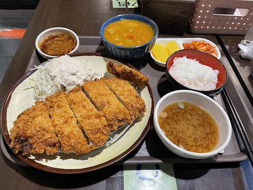 손바닥 크기의 1.5배 정도 되는 제법 커다란 돈까스와 시큼한 맛이 살짝 나는 드레싱 같은게 얹혀진 양배추 샐러드와 밥, 사이드로 옅은 맛의 미소시루, 그 외에 어른의 경우에는 좀 매운 김치가 서브되고, 어린아이들의 경우에는 길쭉두툼하게 썰려진 단무지가 서브되는 듯. 또 갈려지거나 으깨진 참깨가 아닌 통참깨와 머스터드가 옆에 발려진 돈까스소스를 넣어먹는 작은그릇이 제공됨. 돈까스소스는 테이블에 일반돈까스소스와 매운돈까스소스 두종류가 준비되어 있음.
