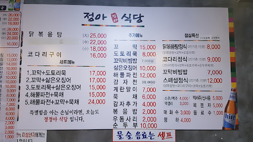 정정아식당은 1984년에 개업했다고 합니다. 메인메뉴는 닭볶음탕, 묵은지닭볶음탕, 코다리구이이며 추가메뉴로 꼬막무침, 해물파전 등 메뉴가 다양합니다. 물과 술, 음료는 셀프입니다.