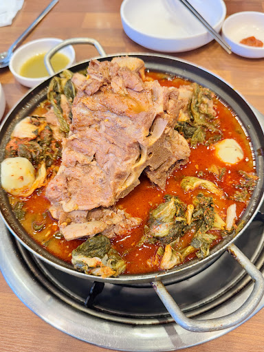 Delicious Gamjatang. Spicy and refreshing. Parking is limited. Delicious kimchi, fresh spicy peppers. Dip the meat in the sauce and enjoy. You can refill the soup while you eat. After you finish eating, you can fry rice and eat it. Oh, and by the end of the meal, you can see how much your chopstick skills...