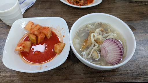 I have mixed feelings about this restaurant. First the "seafood" kalgooksoo is a bit misleading. It's closer to clam and scallop kalgooksoo with a few shrimps. Its kalgooksoo is dried Pollock based stock. It's light and clean stock. Overall the noodle dish was very good and portions were generous. We ordered 3 servings for a party of 4 and couldn't finish. This is very busy place and after I'm initial serving of side dishes, additional servings are self served. It's kimchi was average even though kalgooksoo restaurants tend to offer good kimchi.