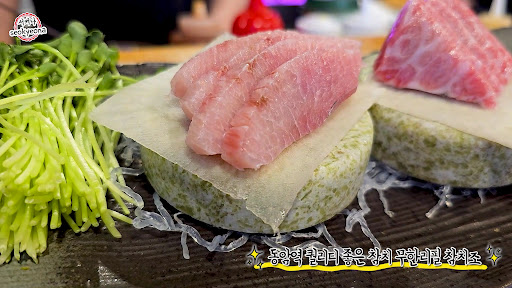 다양한 좌석 구성이 있어 개인적으로 식사를 즐기시거나 단체로 방문하셔도 좋습니다. 테이블석, 룸석, 그리고 다찌 자리가 준비되어 있습니다. 룸은 프라이빗 한 공간으로 특별한 날 특별한 분과 함께 방문하기 좋습니다. 죽은 부드럽고 고소한 맛이 느낄 수 있네요. 백김치는 깔끔한 맛으로 참치와 잘 어울리며, 참치의 고소함을 더욱 돋보이게 해줍니다. 일반적으로 주도는 강한 향과 짠맛이 특징인데, 이는 참치의 내장에서 나오는 고유의 풍미 때문입니다. 메카도로 불초밥도 제공이 됩니다. 참치 조림은 무가 생명이라고 해야 할까!? 도미회를 맛있게 즐기기 위해서 주도를 도미회에 곁들여 드시면 맛이 일품이 됩니다. 곧바로 제공된 가리비회! 갈빗살 부위는 기름진 맛이 적고 담백한 맛이 느껴지다 보니 간장소스보다는 기름장에 먹는 것을 선호합니다. 가마도로 이 부위는 쫄깃한 동시에 지방이 침에 녹으면서 나는 고소함을 느끼면서 먹는 게 포인트! 전복 살은 전복 내장을 살짝 찍어서 먹은 후, 남은 전복 내장에 흰쌀밥을 맛있게 비벼 드시면 된다고 그러시네요. 눈다랑어 배꼽살은 참다랑어에 비해 지방이 적어서 덜 느끼하고, 적당한 식감이 특징! 튀김 속을 자세하게 살펴보니 참치를 잘게 다져서 만든 네기도로를 응용한 튀김이네요. 기름이 쫙 빠져서 고소한 맛이 일품이었던 참치 꼬리 구이! 참다랑어의 적신 은 기름기는 적지만 깊은 맛의 풍미를 느낄 수 있습니다.
