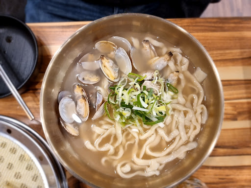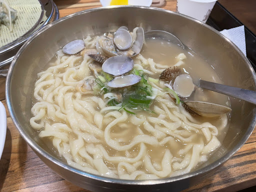 Because of a long layover we stayed in a hotel in Incheon. Not having a lot of time we stumbled upon this nice small restaurant. We ordered a chopped noodle with clam and a spicy version of the same and a portion of steamed pork dumplings. The staff was very friendly and gave us children cutlery as well as two small pieces of chocolate. The noodles were nicely cooked and chewy and the broth was nice. They are not stingy with the number of clams per bowl. The pork dumplings were delicious! Considered the amount you get, it's really not...