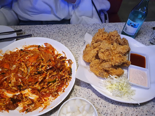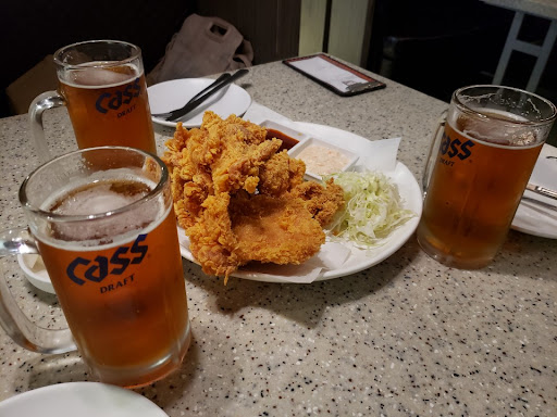 Great chicken place, though I prefer the Songdo Location. Great atmosphere. The Red Rock draft bear is excellent. By far my favorite Korean draft beer. Try it! The chicken is very tasty. Crispy with a slight spicy flavor and comes with 2 dipping sauces of sweet chili and something like thousand islands. Also some addicting rice snacks...