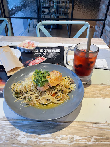 I had salmon and pasta, and it was really good! I also ordered the plain bread, and that was a good choice. It was very lightly toasted, which I like. I didnโt like the triple berry ade because it...