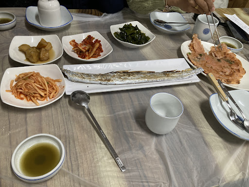 We had the abalone porridge and seafood hotpot, which came with a pretty good spread of side dishes. We also got a free pancake and grilled cutlass fish, and when they saw that we had cleaned out the fish, they topped it up with another :D