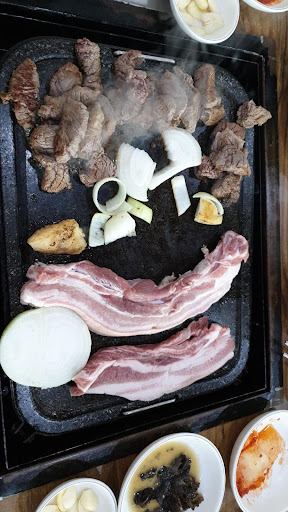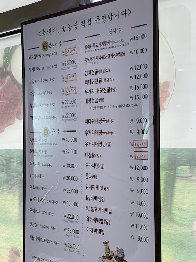 The lunch is cheap 7000-9000 and the food is quite good aswell. Large servings. They don't speak English very well, or basically at all. The lunch menu is in Korean only but there was one guy who could translate what types of meat there were so it worked out for us. They do serve horse here if you have any political reasons for boycotting...