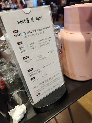 전에 지인추천으로 서귀포점을 다녔갔을 때 너무 맛있게 먹었던 기억이 있어서 이번에 제주에서 휴가를 보내고 마지막 식사로 제주시에 있는 곳으로 갔어요. 바다를 본 돼지라는 명성에 맞지 않게 바다 뷰가 없어서 좀 실망스러웠지만 맛있게 먹었던 기억에 그래도 설레임으로 자리를 잡았어요. 저희는 수요일 5시 좀 넘어 방문했습니다. 테이블 총 12개 있는 협소한 공간이었지만 자리는 금방 바로 앉았구요. 앞에 주차장도 한 5대 정도인가만 주차할수 있는 좁은 공간이지만 마지막 주차자리 잡았습니다. 2인 흑돼지 6만원, 목살 추가 2만원, 해물된장찌개 7천원, 돌솥밥+멜조림 4천원 총 9만천원 나왔습니다.