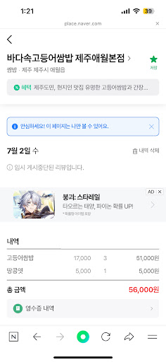 익숙하지만 서울에서 맛보지 못한 건강하면서 짜지않은 고등어김치찜 비싸지않은 가격에 로컬도 많이 찾는듯함 식사시간 피해서 갔는데도 계속 회전됨 테이블은 14개여서 나름 여유있음 부모님 모시고 제주오면 모시고 갈 것 같은 음식점 실제로 가족단위 고객이 많았음 먹고나서도 물을 바로 안찾게되어서, 조미료를 많이 넣지않은 것 같았음
