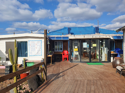 하지만 바다가 더해지니 정말 절경이고요 신이 주신 선물입니다!!! 산책로 입구에 월령리 벽지도가 있는데 거기에 식당 표시가 들어있다 잘 만들어진 올레길... 따라가다 보면 식당 간판이 나오는데 그냥 일반 주택 같지만 돌하르방 안고 있는 영업 중 간판이 이곳이 식당이라고 알려준다 돌하르방 열일 하십니다!!!