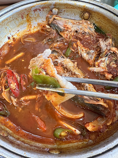들어가있는 전갱이가 한마리가 어찌나 큰지, 다 안들어가서 뚝배기안에 반토막+반토막으로 들어가 있음.