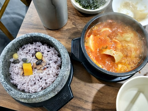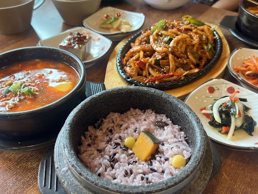 The meal comes with 6 different kinds of side dishes and a side of healthy purple grain rice in a hot stone bowl. It doesn't get any better than this!