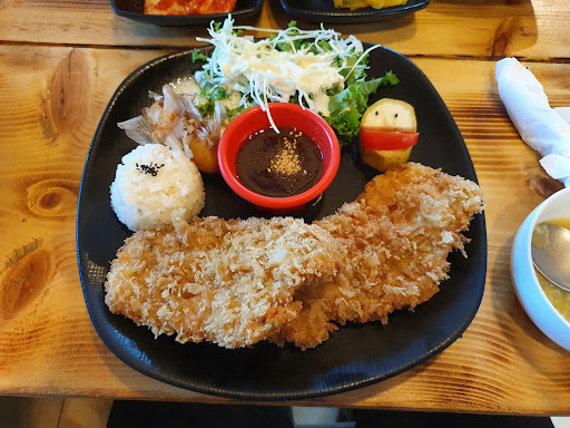 El curtle pork o tonkatsu como.le digan estaba bien pero creo que le ponen un condimento ( jengibre) o no se cuรกl...que hace que tenga un gusto raro? Pero no malo, es raro, pero es muy grande la porciรณn y linda presentaciรณn โค๏ธ Pedรญ un bibimbap pero no tenรญa huevo, tenรญa manzana y cosas que no habรญa comido antes en un bibimbap o quizรกs yo entendรญ mal el menรบ pero no fue un platillo que haya disfrutado pero comรญ todo igual porque tenรญa hambre jajajajaja El chico que nos atendiรณ habla inglรฉs y es muy amable y guapo hahaha lo siento, no pude evitar fijarme en eso La sopa que trae la comida es muy deliciosa, es de arroz โค๏ธ no es caro y la comida...