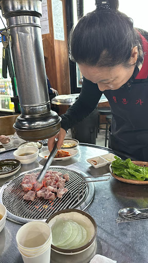 The ajumma help roasting my pork was incredibly friendly and teach me how to eat in local style. Other staff are trying to take care of me too seeing me as a solo traveller.