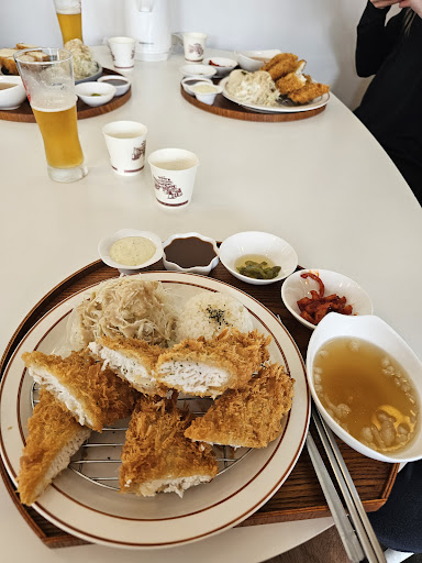 제주흑돼지돈가스는 두툼한 등심 돈가스에 멘치까스 1개가 곁들어져 나왔어요. 등심돈가스는 겉바속촉으로 부드러웠으며, 멘치까스는 명절에 집에서 해먹는 동그랑땡을 빵가루에 묻혀 튀겨낸 맛이 었으며 야채와 고기의 조합이 아주 좋았어요.