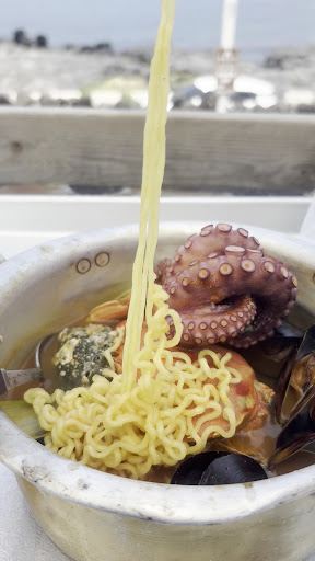 The Food was good, like the broth was rich and the seafood were fresh. Recommend ordering non-spicy, it still has a little kick to it. There was loads of mussels and clams, however the crab was a little mushy, but the octopus, scallop, prawns were all great. The octopus platter was really good too, dipping it into the sesame oil brings out the fresh seafood taste of it. All is good but the reason why I'd give it 3 stars. The service was really bad. I wouldn't say bad but just that there wasn't staff outside the shop, many customers did not know how to take the queue number. Apparently we had to scan the qr code on a tablet, but there wasn't even a tablet, many of the customers including us were lost beyond lost. So u actually had to take a queue number, then when the staff calls for the number, then u head to the counter to order the food, then u could find a seat to sit and wait for them to call your number again to retrieve the food. We were told not to find a seat before we ordered, but many others actually sat before even ordering. When we asked the staff, they were poor in English too, could not understand us, but I'd give a thumbs up for them for trying to use Google translate to converse with us. Oh and to get there, it's really tough unless you get there by car. By bus, you'd have to walk for around 20 mins, we didn't mind it, we were strolling through the locals houses, got to see some of their houses and crops they were growing. As long as you're reaching the sea, you'd know you're nearby already. We also went around 1pm, queue...