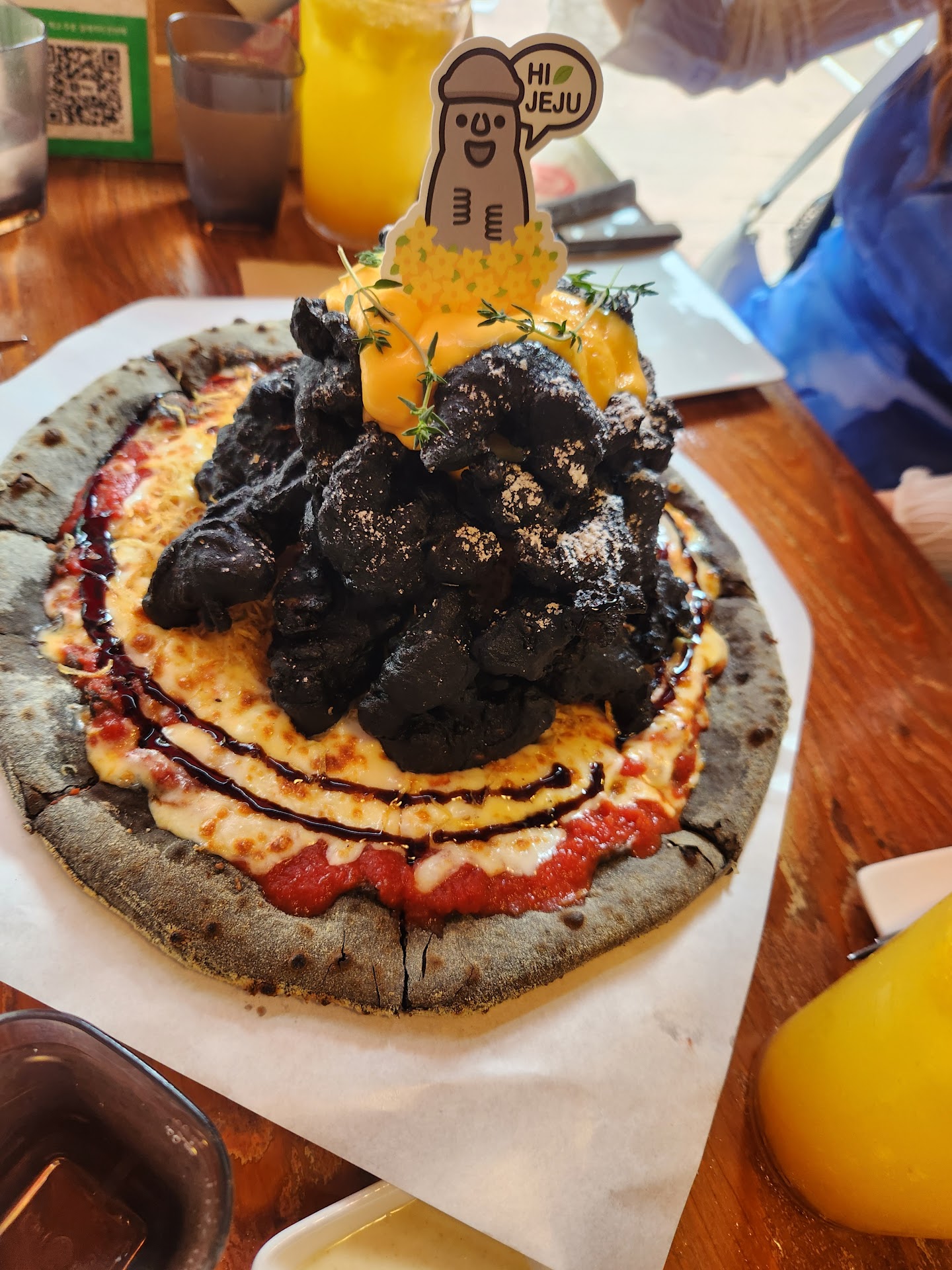 Pizza is made of the following: dough: should be something along the line where’s it is mochi charcoal dough since it’s chewy pizza tomato sauce: can’t really taste it honestly mozzarella cheese: for the cheese pull effect, nothing much topped with fried thin potato pieces with cheese powder sprinkled over dk what’s the black black thing sorry prawns: should be coated with something sweet and has the haebeehian taste cheese sauce: tasted like nacho cheese. accordingly to their cooking videos shown in store, they should be using the prawn broth + cheese mayo