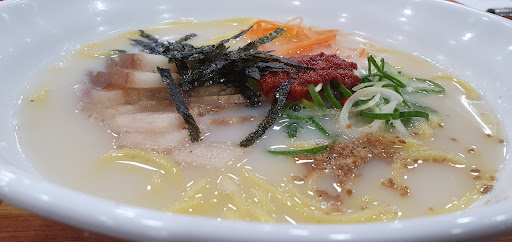 맛있게 먹는 방법을 종업원에게 물어보니 짧게 썬 김을 적당히(너무 많이 넣지 말고 적당히) 올려 먹으라고 알려줍니다. 알려주는 방법으로 김을 얹고 면을 말아 먹어봅니다. 면보다 돼지 사골국물의 깊은 맛이 감지 됩니다. 오랜 시간 동안 우려낸 돼지사골국물 맛은 누가 뭐래도 시비를 걸 수 없는 진한 국물 맛을 냅니다.