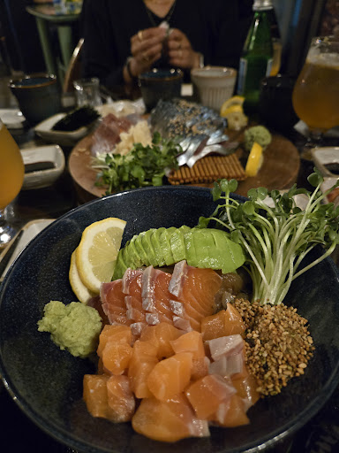 All the food is very delicious and portion is right. I particularly like the salmon stew that uses the sashimi salmon head and bones, the meat is really very tender and the taste is great. The sashimi is also feels very fresh. After trying both fish I would still stick with salmon sashimi as a personal preference as itโs fattier. Although I would still recommend you try their sashimi assortment. We were glad to stop by this place after all the places around is closed. This is one of the places that opens till late....
