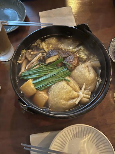 The hot pot was delicious and comforting, and the mapo tofu udon noodles were really tasty too. The bean falafel and teriyaki mushrooms were quite good, but the dishes themselves weren't particularly outstanding.