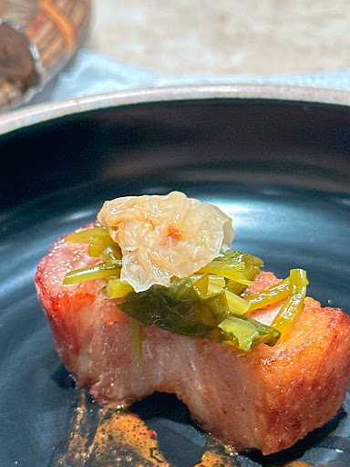The dry-aged pork itself was absolutely delicious. The texture was tender with a rich, concentrated flavor that you can only get from proper aging. The meat had a beautiful balance of fat and lean cuts, and when grilled, it developed a perfect caramelized crust while staying juicy inside. They served it with fresh greens, pickled garlic, and other banchan (side dishes) that complemented the pork wonderfully. The king oyster mushroom with Korean branding on it added a fun and flavorful element to the meal. We also enjoyed a hearty bowl of spicy stew that rounded out the experience beautifully.